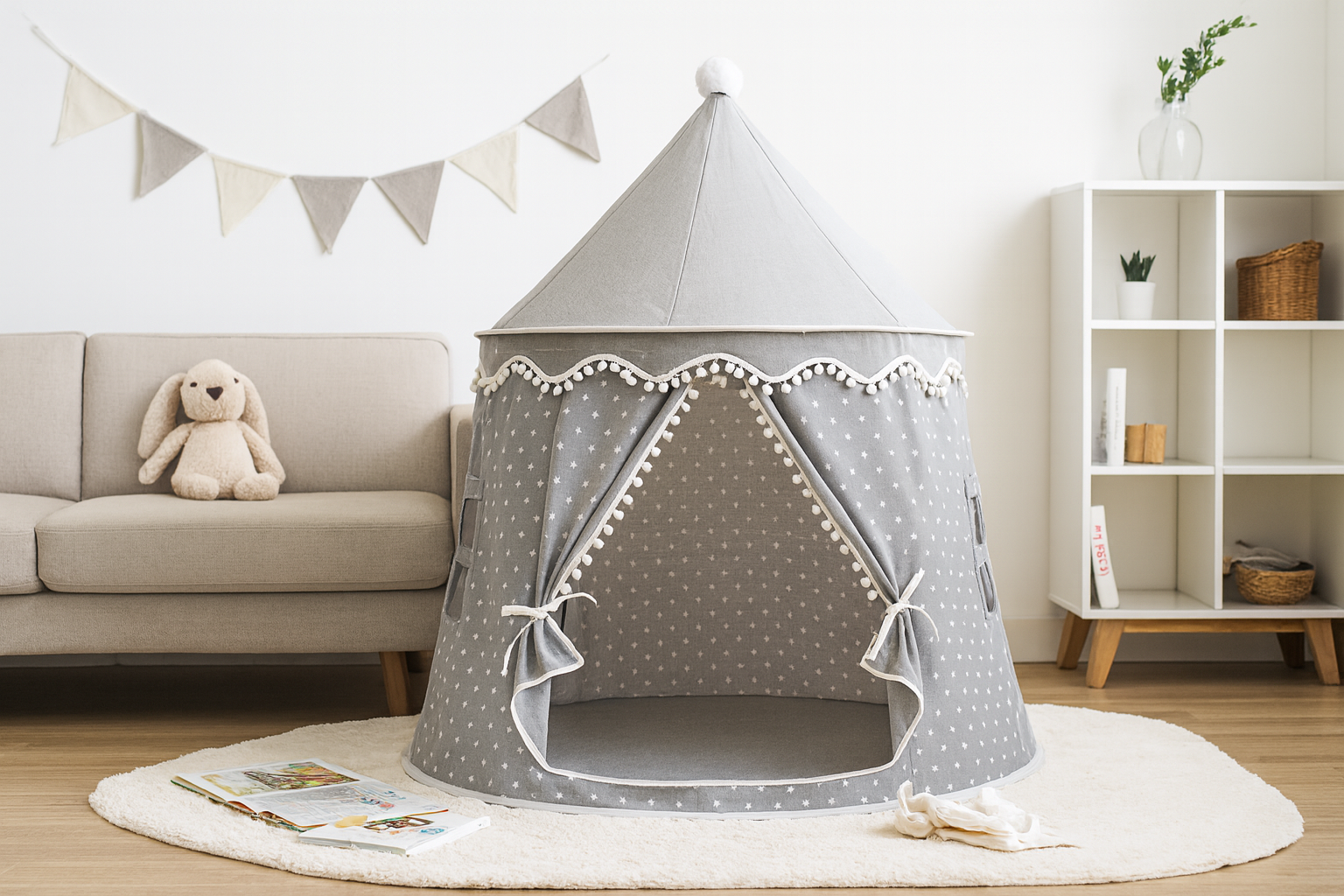 Son design arrondi et élégant, ses guirlandes à pompons et sa toile subtilement étoilée en font une cachette féerique pour lire, jouer ou s’inventer des histoires sous les étoiles — même en plein jour.